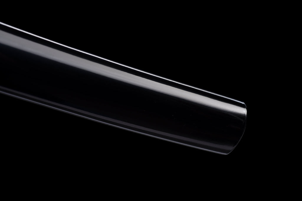 Fodero (Saya 鞘): La lacca nera lucida è impreziosita da un suggestivo intarsio di drago argentato, abbinandosi perfettamente al sageo blu navy.
