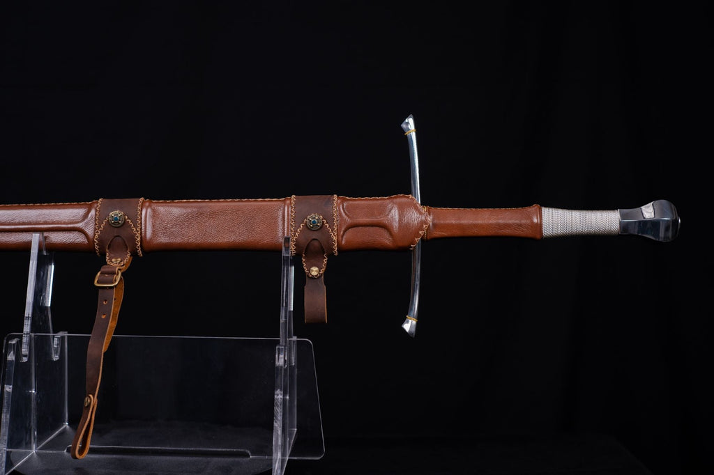 Impugnatura: Costruita in legno e rivestita in pelle bovina, l'impugnatura di 23 cm fornisce una presa confortevole, ben adatta alla leva necessaria nel combattimento a due mani.