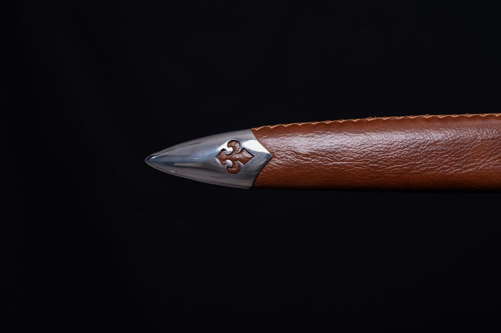 Fodero: Realizzato in legno e completamente rivestito in pelle bovina, il fodero è sia funzionale che elegante, offrendo protezione per la lama quando non è in uso.